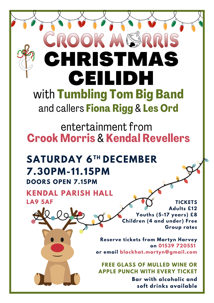 2022 - December - The annual Christmas ceilidh for Crook Morris returned to a refurbished Kendal Parish Hall, the home of the event for many years prior to the Town Hall. Another great evening playing with the Big Band. Thanks as usual to Ben Farmer, our sound man on the night. Crook Morris said afterwards - The Tumbling Tom Big Band were quickly on fine form with a full dance