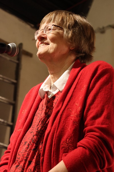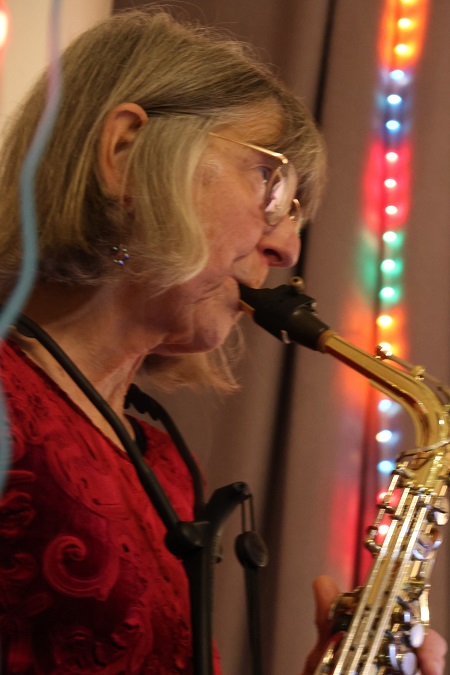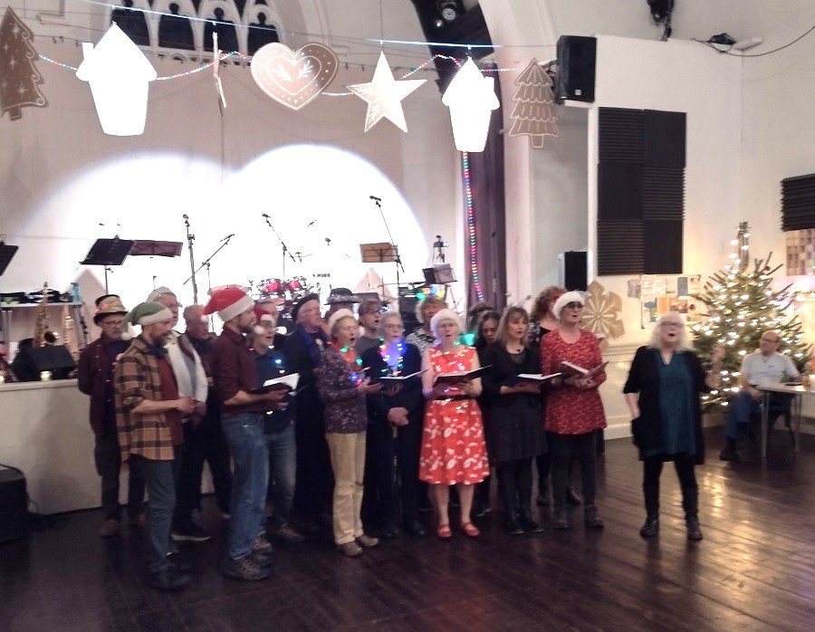 floor and a hall full of happy smiling faces. It was however tinged with sadness, as Fiona and Tony are both retiring from the band after being part of it since 1997. Thanks to both for their playing and company over those years. How can we manage without them: it will be difficult but we'll re-structure somehow. Our dep bass player Mark Robinson recorded much of the evening for us on video, and these all give a flavour of the night - The photo below from Jen Wilson shows the band opening the evening by singing Steve's song Season of the Year, prior to playing Deck the Halls for the opening polka. |